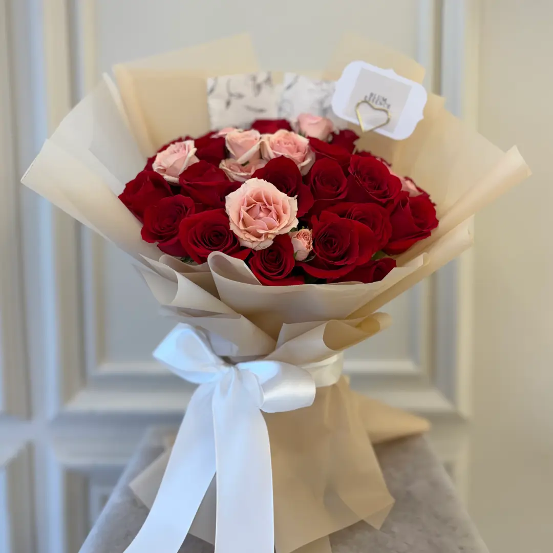 Encanto Rojo es un ramo diseñado para impresionar. Destaca por su abundancia, combinando entre 24 y 35 rosas rojas de exportación con delicados toques de mini rosas que aportan textura y movimiento. Envuelto elegantemente en papel coreano para un acabado profesional.